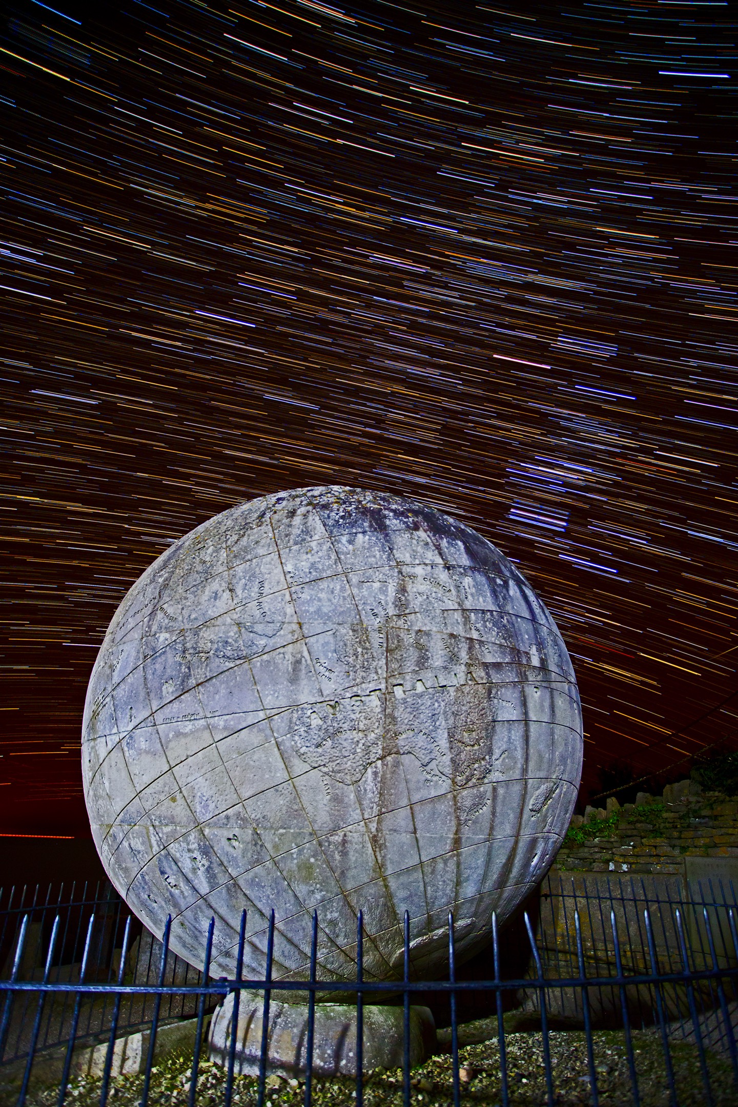 Star trails Stone globe Dueleston Country Park Swanage.