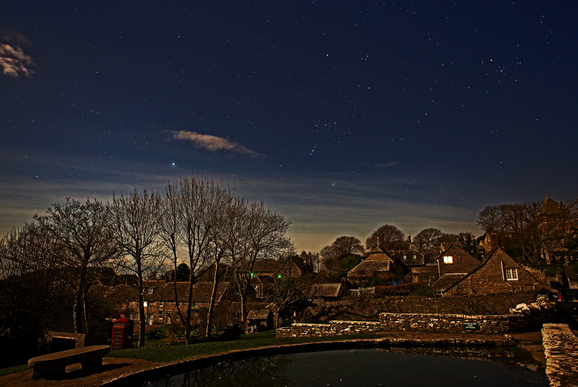Village pond at Worth Matravers illuminated by the rising full Moon. With Sirius ( brightest Star in the sky after our Sun )- Orion and Taurus .